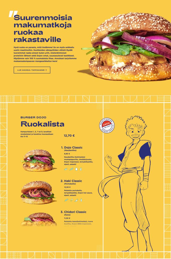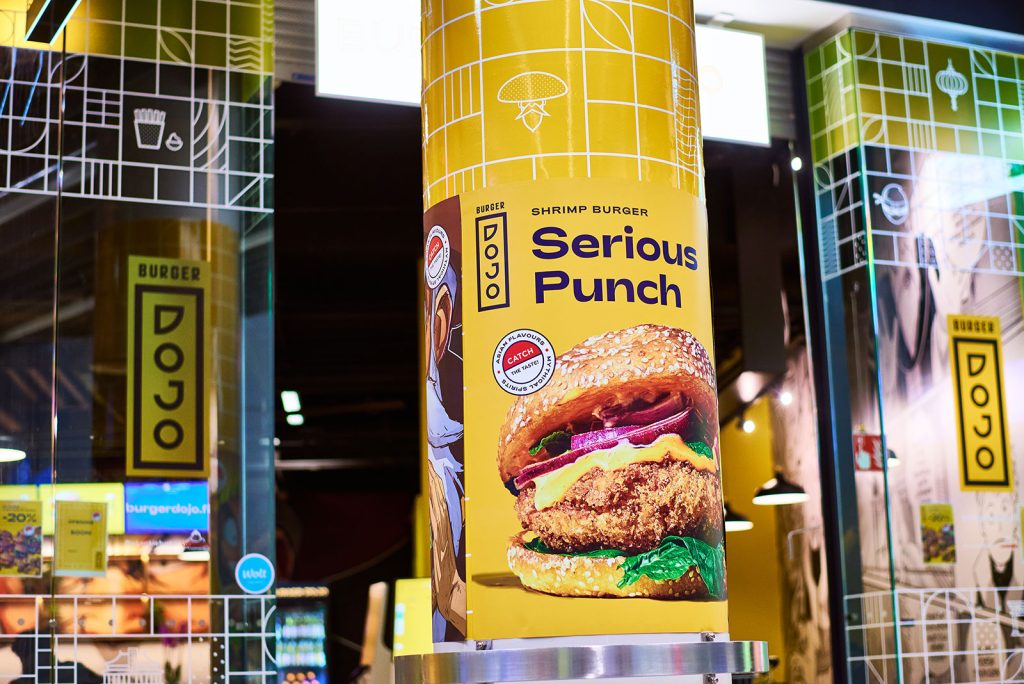 Burger Dojo on Suomessa ennennäkemätön ravintolakonsepti, joka yhdistää aasialaiset maut, hampurilaiset ja yrittäjän rakkauden animeen. Siksi myös luova ratkaisu rakentui tarinan muotoon, joka toistuu kaikissa brändin kohtaamispisteissä animesta tuttuja tehokeinoja käyttäen. Aasialaisia elementtejä tyylikkäästi hyödyntävä brändi tempaa mukaan seikkailuun, joka vie uusien makujen etsijän löytöretkelle.